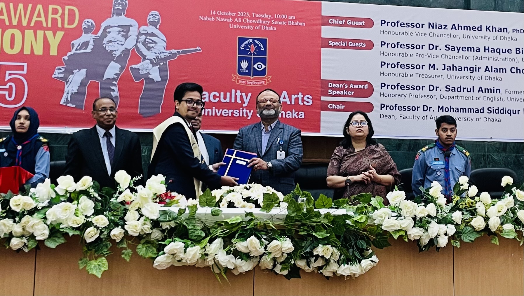 He received the awards for his outstanding performance in both his Bachelor of Arts (Dean’s Award of Academic Recognition) and Master of Arts (Dean’s Award of Honour) programs. The Dean’s Award Ceremony 2025 took place on 14 October 2025 at the Nabab Nawab Ali Chowdhury Senate Bhaban, University of Dhaka, and was presided over by Professor Dr. Mohammad Siddiqur Rahman Khan.