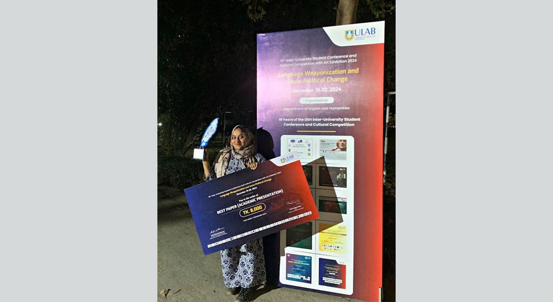 Afnan Bintey Helal, a student of MA in English program at East West University emerged triumphant as the recipient of the prestigious “Best Paper Award” at the 10th Inter-University Student Conference and Cultural Competition 2024. The competition, organized by The Department of English and Humanities at ULAB, explored the theme “Language Weaponisation and Sociopolitical Change.” Competing against participants from 28 universities, both public and private, across Bangladesh, Afnan Bintey Helal’s paper secured her the position of champion for its originality and in-depth analysis of the theme.