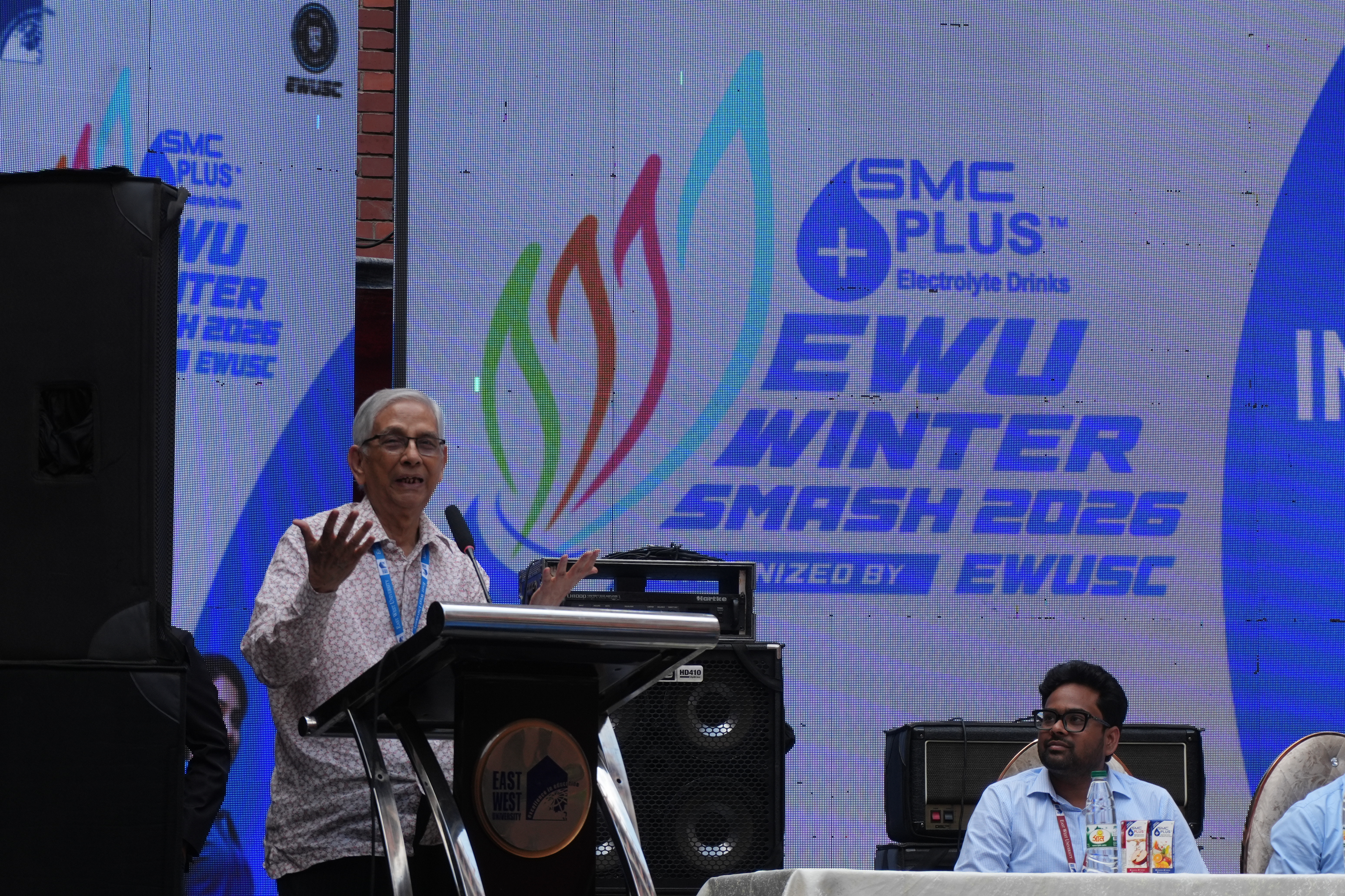On 05 April 2026, the grand Inauguration Ceremony of SMC Plus Electrolyte Drink EWU Winter Smash 2026, organized by the East West University Sports Club, marked a vibrant and a memorable beginning of the event. The ceremony was held at the courtyard of East West University and honored by the presence of the following distinguished personalities: Professor Dr. Mohammed Farashuddin, Chairperson, Board of Trustees, East West University (EWU), as the Chief Guest, along with Professor Dr. Md. Ashik Mosaddik, Pro Vice-Chancellor, EWU, Mr. Toslim Uddin Khan, Managing Director & CEO, SMC Enterprise Ltd, Mr. Abul Bashir Khan, FCMA, CFO, SMC Enterprise Ltd., Md. Ismail Hossain, Brand Manager, SMC Plus, Ishmat Shereen, Advisor, Students’ Welfare and Head of CCC, EWU, Professor Dr. Md. Mobarak Hossain Khan, Moderator, EWU Sports Club, and Abdur Rahaman Sumon, Moderator, EWU Sports Club.
