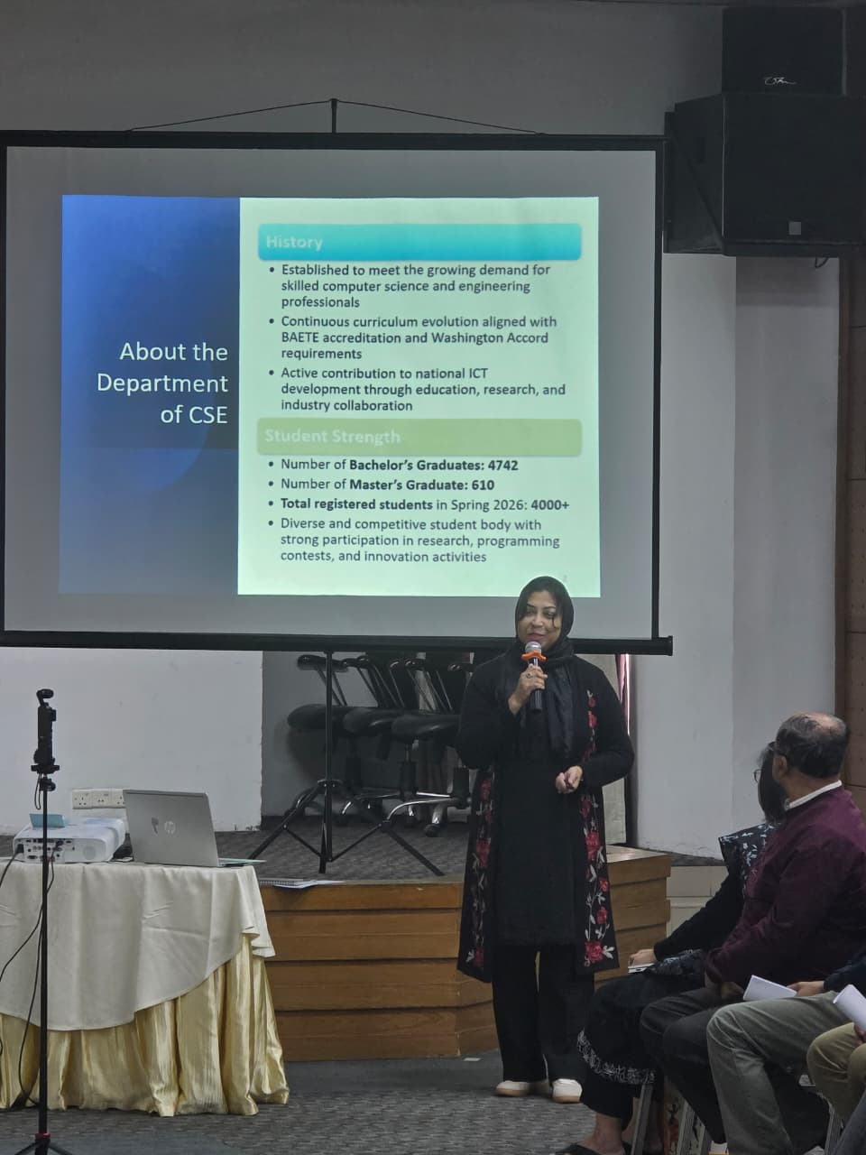 Departmental presentations were delivered by the Chairpersons of Civil Engineering, Computer Science and Engineering, Electrical and Electronic Engineering, Genetic Engineering and Biotechnology, Mathematical and Physical Sciences, and Pharmacy. Each department presented comprehensive reports highlighting achievements, challenges, and strategic future plans. The sessions were followed by interactive question-and-answer segments, where faculty members actively shared constructive feedback and forward-looking recommendations.