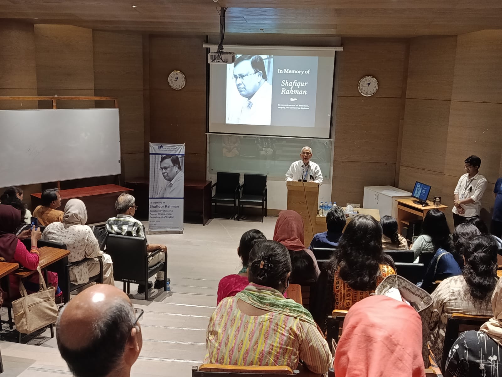 A memorial program was held in honor of the late Mr. Shafiqur Rahman, Assistant Professor and former Chairperson, Department of English, East West University, on Wednesday, April 15, 2026. The event took place from 12:00 PM to 1:30 PM at the Razia Samad Lecture Gallery, Room 242, at East West University. The program was hosted by Dr. Afia Arafat, Assistant Professor, Department of English. East West University.