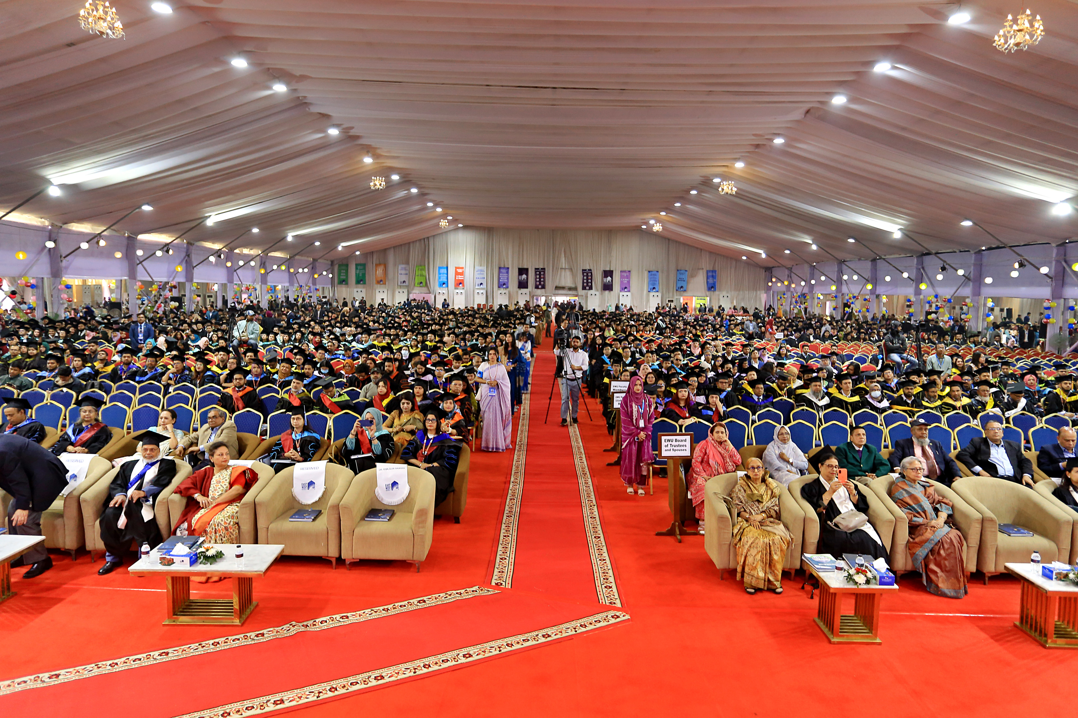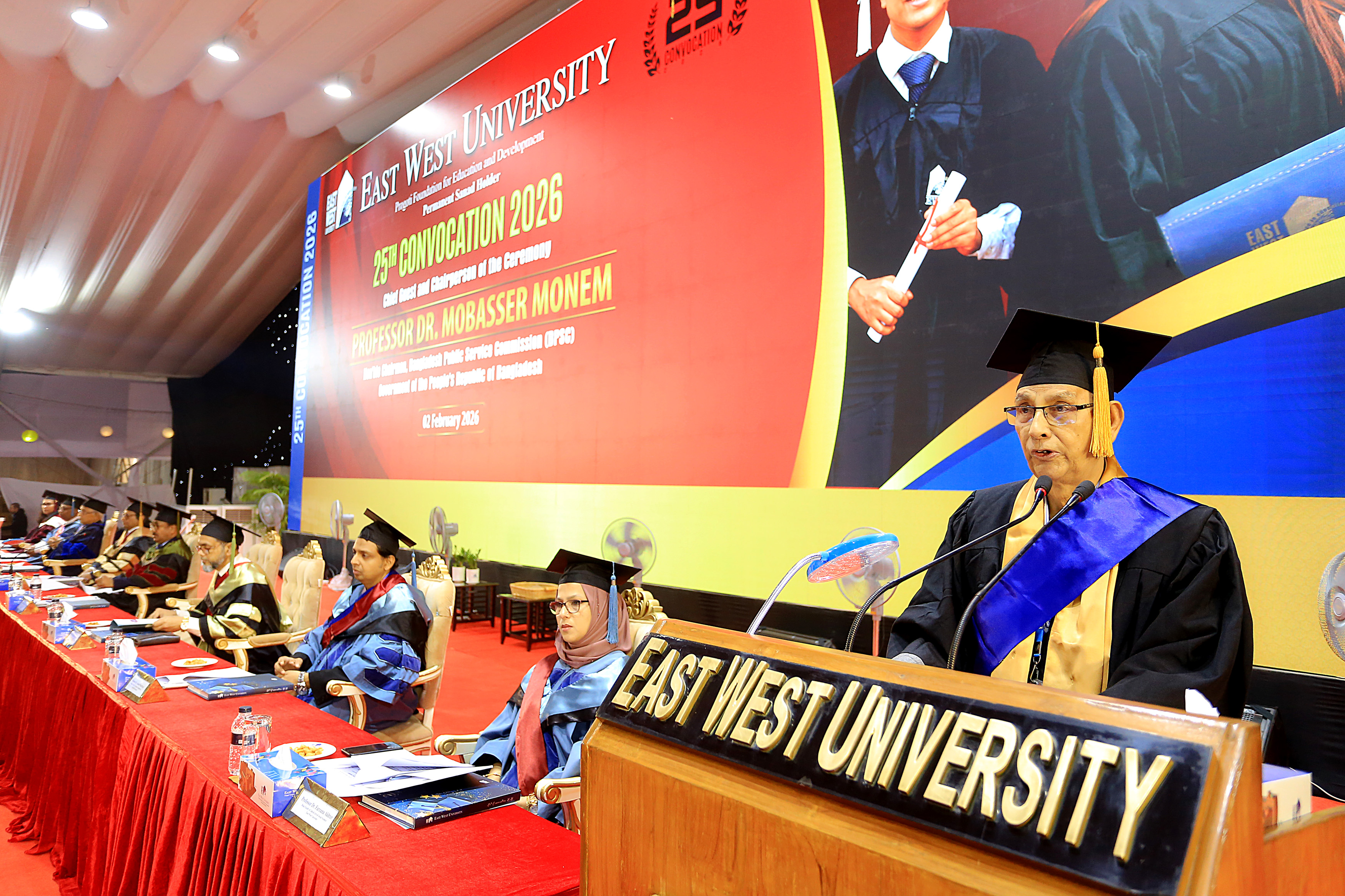 The 25th convocation of East West University (EWU) was held on 02 February 2026 (Monday) at Aftabnagar Playground in the capital. At the convocation, as the representative of His Excellency the President, the Chancellor of the university, Professor Dr. Mobasser Monem, Chairman of Bangladesh Public Service Commission (BPSC), presented degrees to the students. 1857 students of undergraduate and graduate programs were awarded certificates at this convocation. In addition, nine exceptionally meritorious students with a CGPA of 4.0 out of 4.0 were awarded gold medals.