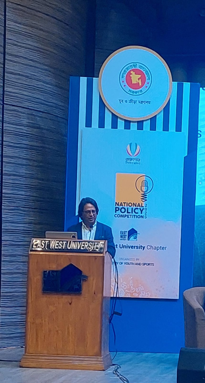 The session began with remarks from Md. Farhan Faruqui, Faculty of Business Administration, East West University. This was followed by a speech from special guest Dr. A. K. Enamul Haque, Director General, Bangladesh Institute of Development Studies (BIDS). Next, Md. Iqbal Hussain, Additional Secretary (Administration Wing), Ministry of Youth and Sports, addressed the audience with his insightful thoughts. The speeches continued with the Chief Guest, Dr. Anisuzzaman Chowdhury, Special Assistant to the Chief Advisor (State Minister Rank), Ministry of Finance, Government of the People’s Republic of Bangladesh, who shared his inspiring words. Finally, the Chair of the session, Professor Shams Rahman, Vice Chancellor, East West University, delivered his speech, highlighting the significance of youth participation in policy making. To conclude, Professor Dr. Mohammad Ashik Mosaddik, Pro