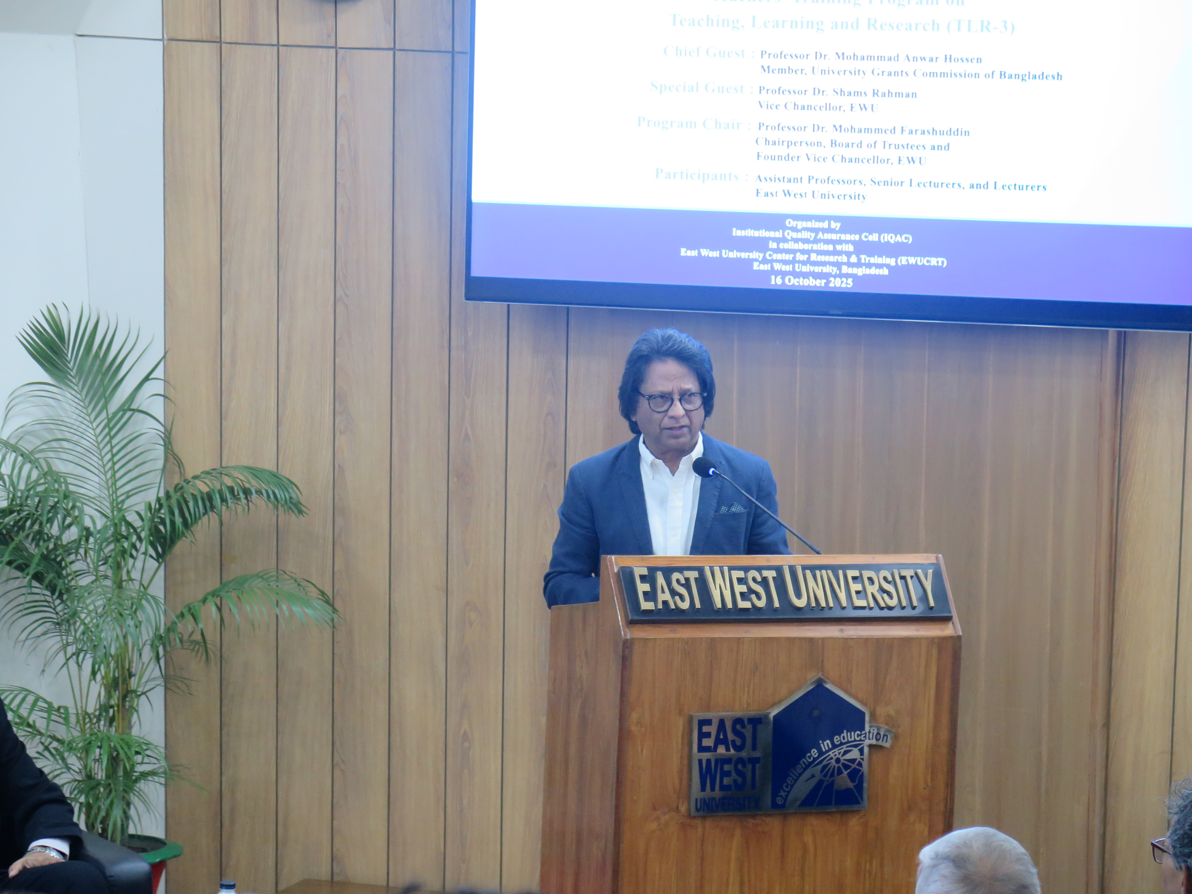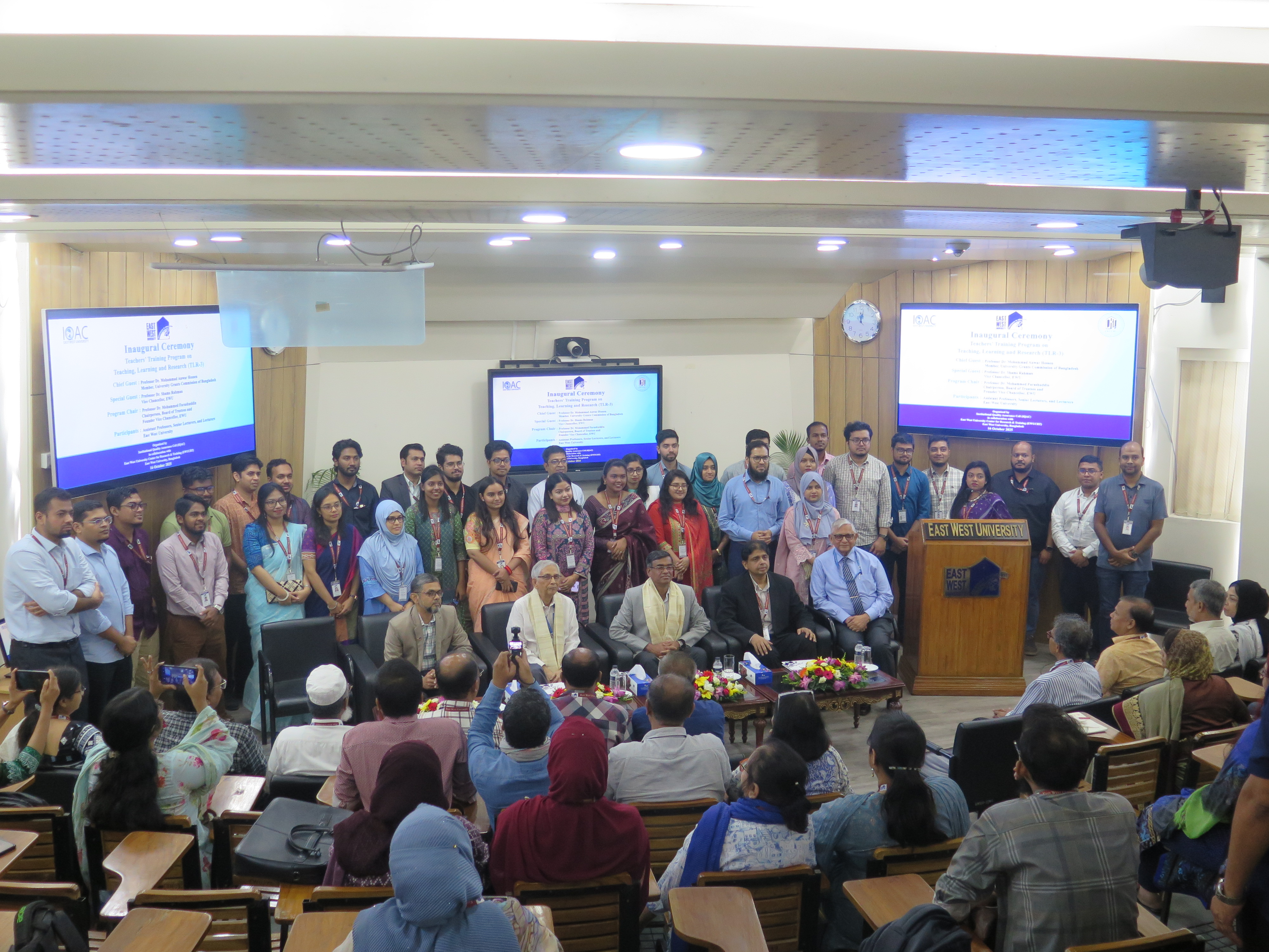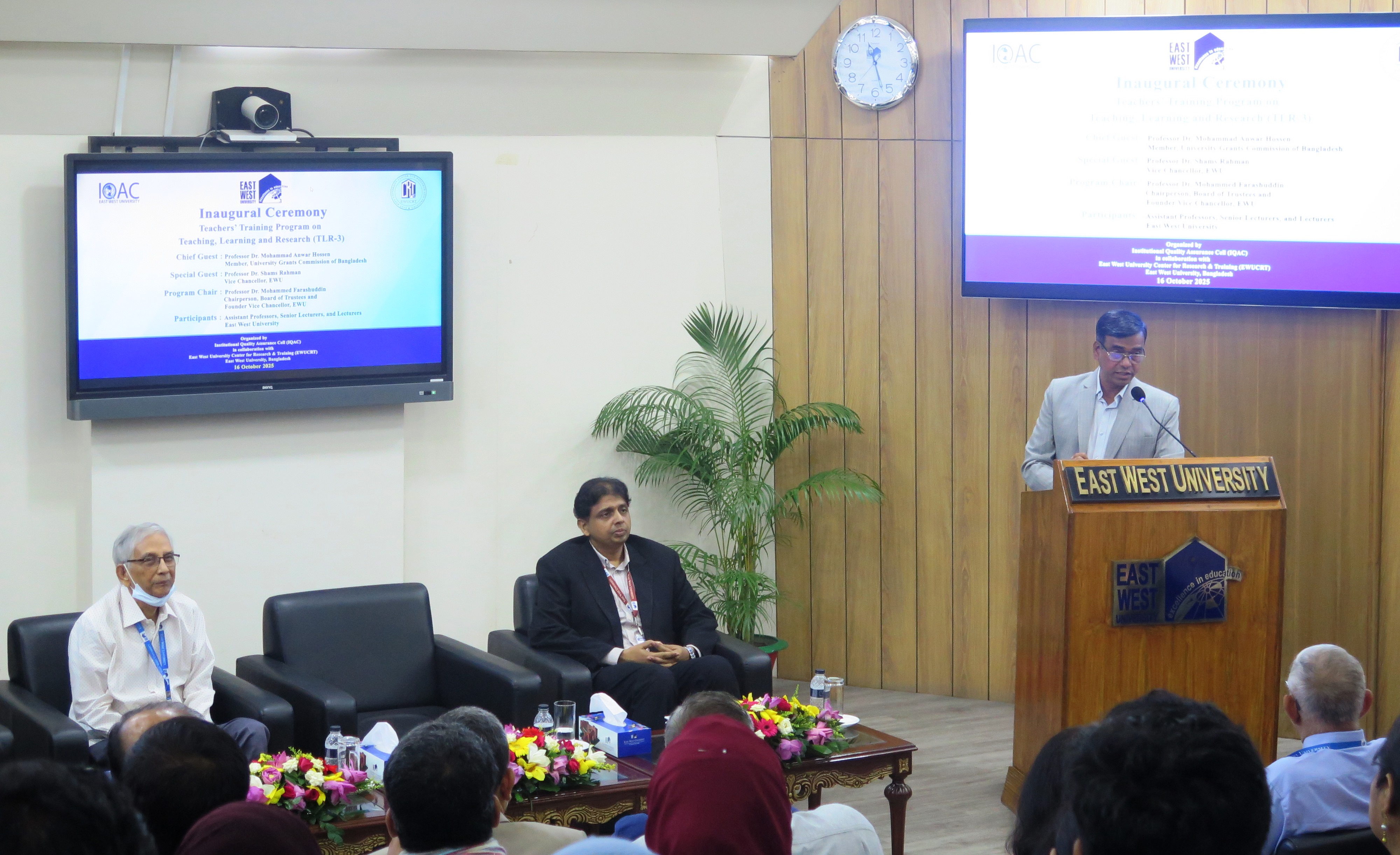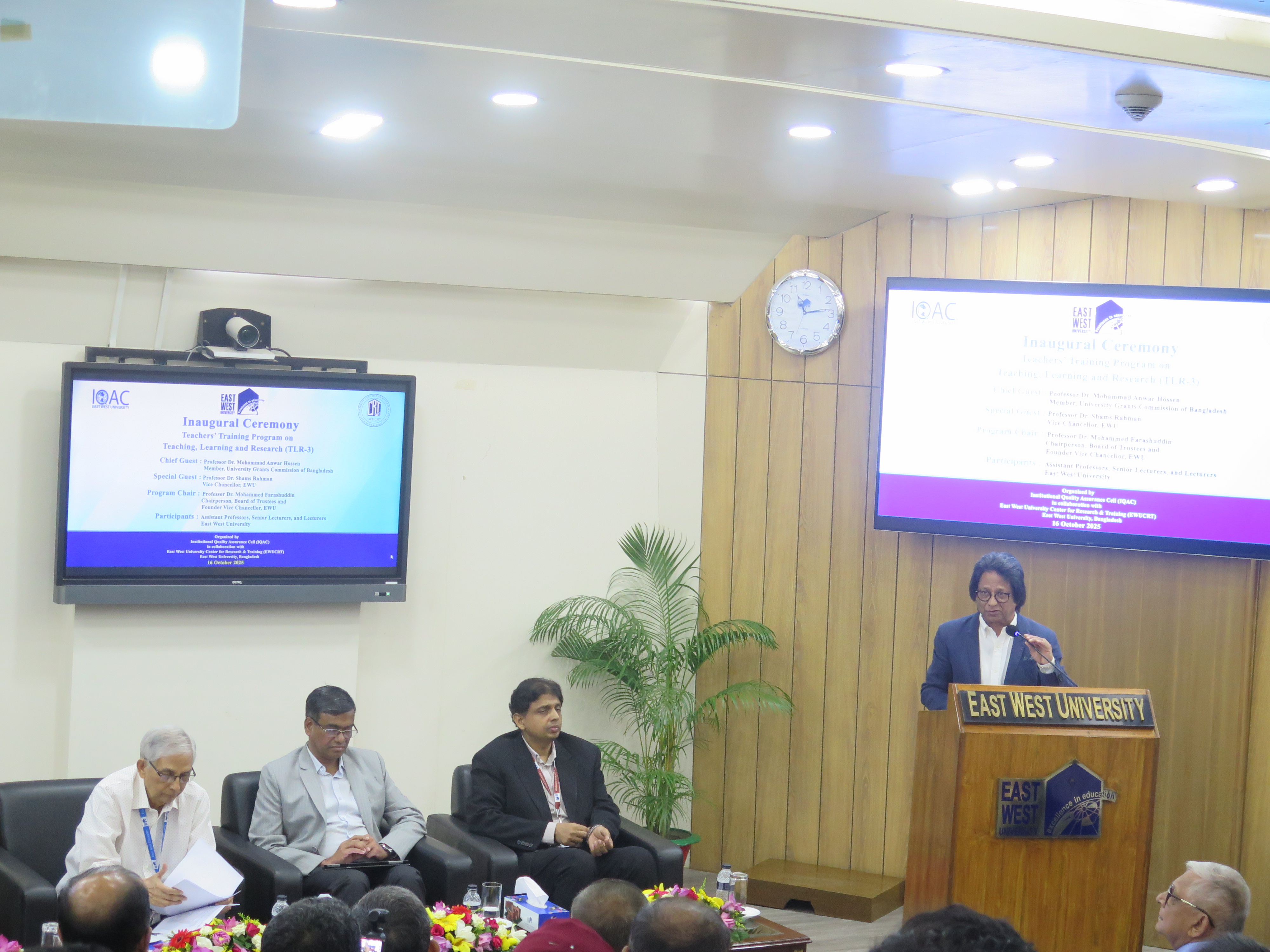 The inaugural session of the Teachers’ Training Program on Teaching, Learning, and Research (TLR) – Third Phase – was held at the S. M. Nousher Ali Lecture Gallery of East West University (EWU), Aftabnagar, Dhaka, on 16 October 2025. Professor Dr. Mohammad Anwar Hossen, Member, University Grants Commission (UGC) of Bangladesh, graced the occasion as the Chief Guest. Professor Dr. Mohammed Farashuddin, Chairperson of the Board of Trustees and Founder Vice Chancellor of EWU, presided over the session as the Program Chair. Professor Dr. Shams Rahman, Vice Chancellor of EWU, attended the program as the Special Guest.