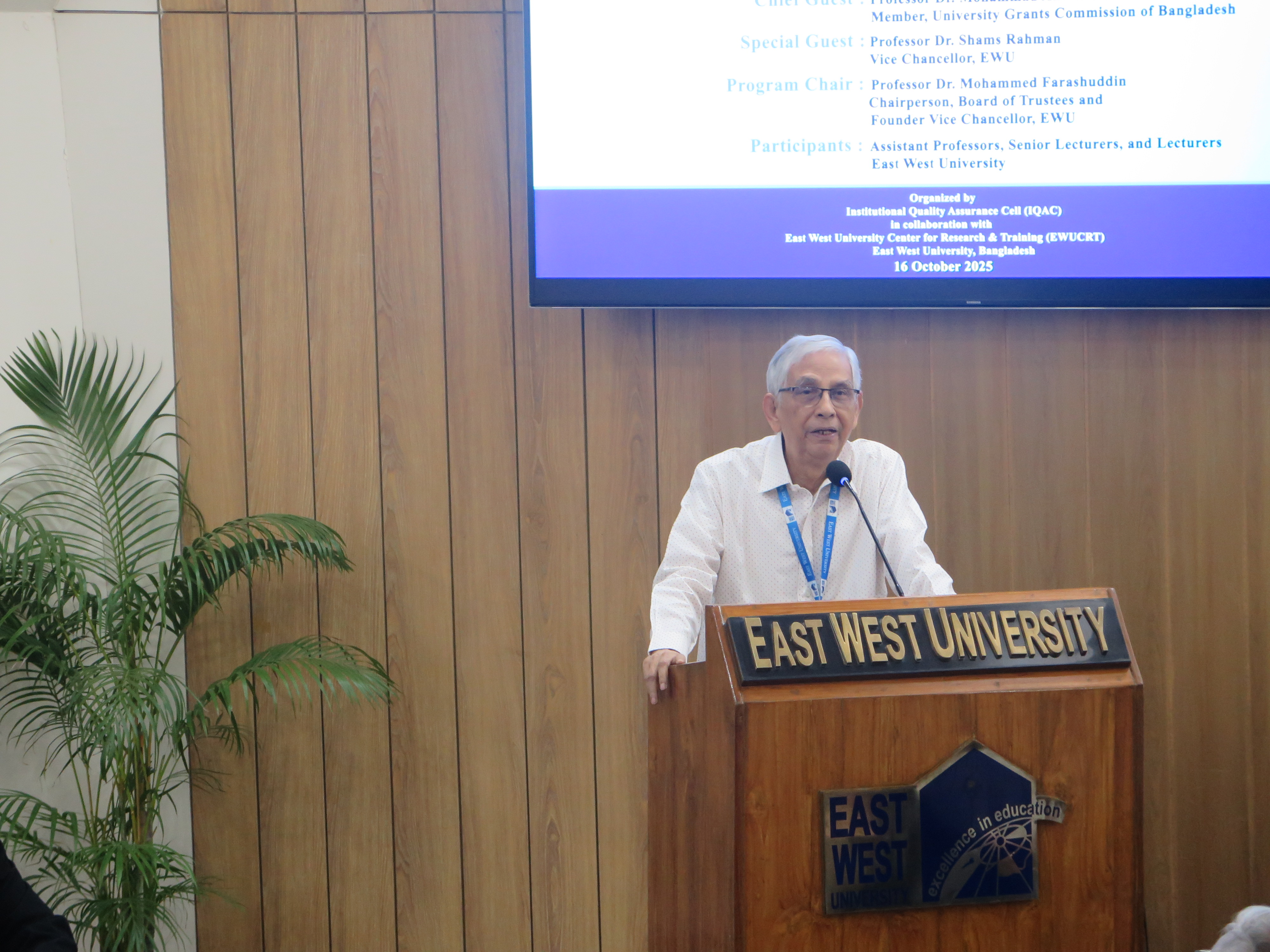 In his speech, the Chief Guest, Professor Dr. Mohammad Anwar Hossen, praised East West University for its ongoing efforts to enhance the quality of higher education through systematic faculty development initiatives. He highlighted that EWU is an iconic symbol of educational excellence for other institutions, noting that its Chairperson of the Board of Trustees is one of the most honest and efficient individuals in the country. Additionally, he mentioned that the Vice Chancellor is a renowned scientist, recognized among the top two percent in the world, and an outstanding educator.