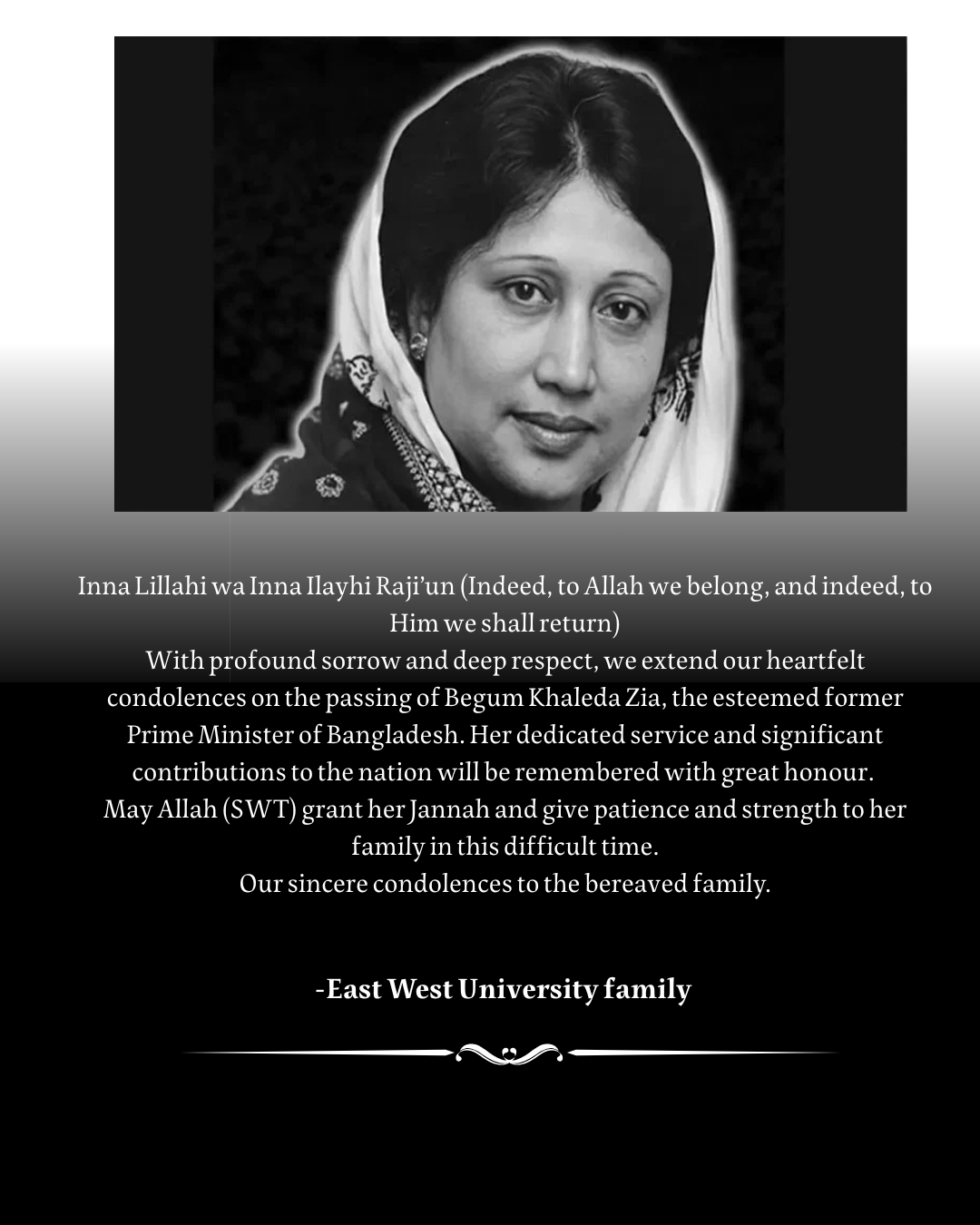 With profound sorrow and deep respect, we extend our heartfelt condolences on the passing of Begum Khaleda Zia, the esteemed former Prime Minister of Bangladesh. Her dedicated service and significant contributions to the nation will be remembered with great honour.