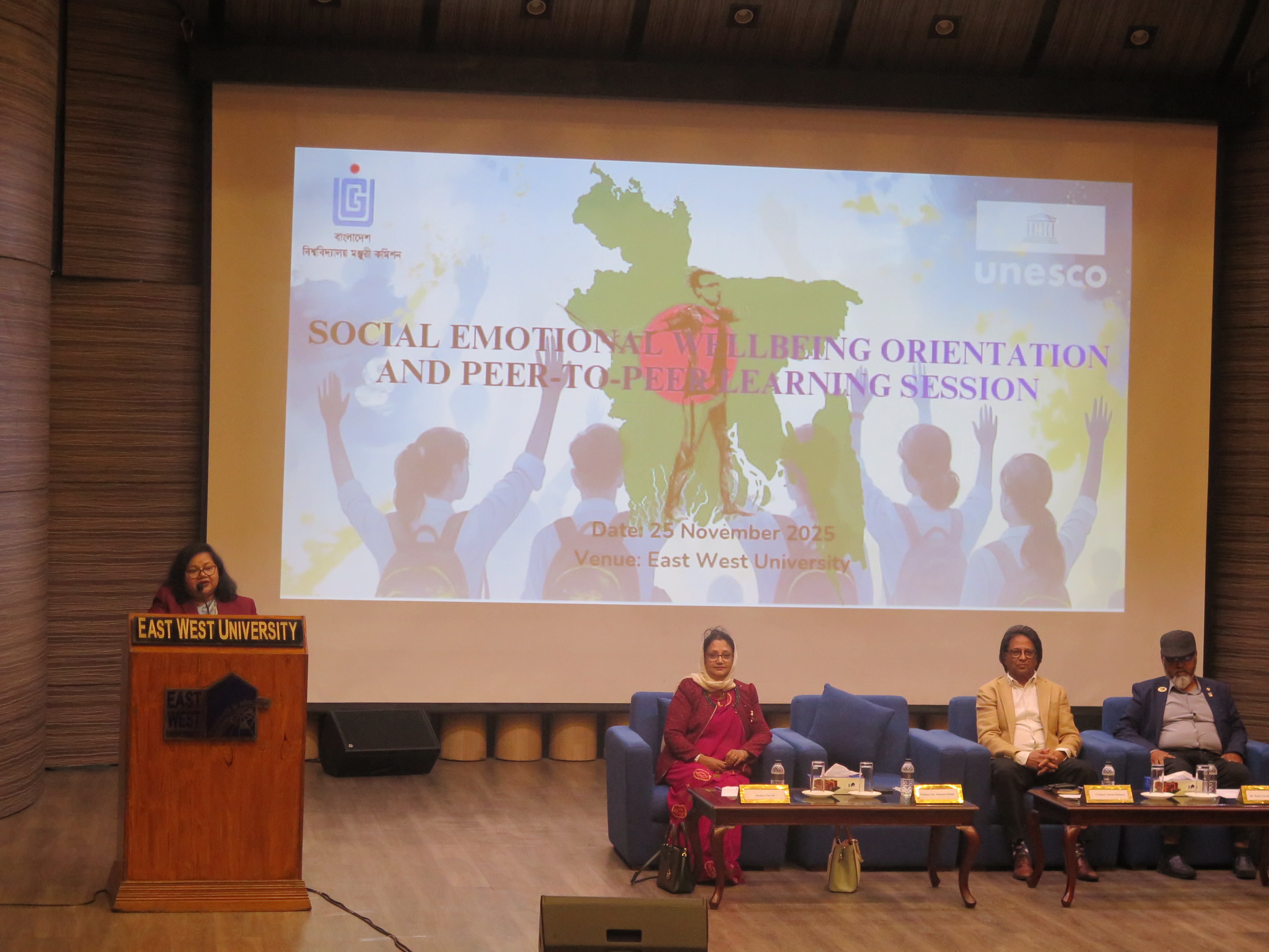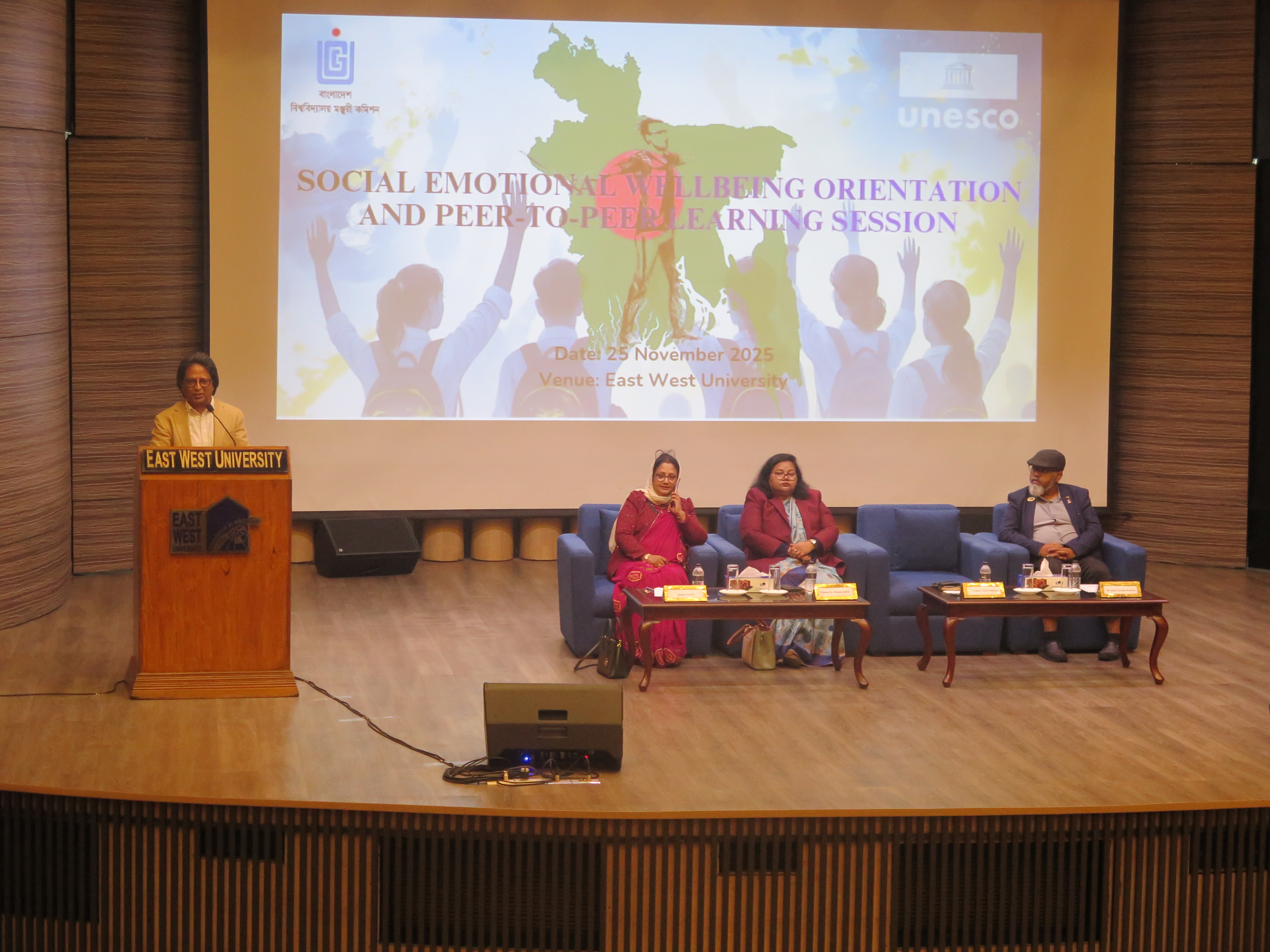 The department of Students’ Welfare of East West University (EWU) hosted a vital "Peer-to-Peer Orientation Learning Session on Social Emotional Well-being" on November 25, 2025, at the Manzur Elahi Auditorium. The program was organized by the University Grants Commission (UGC) of Bangladesh, in collaboration with UNESCO. The session was designed to equip students with the necessary skills to manage academic pressures, enhance mental resilience, and build effective support networks among their peers.