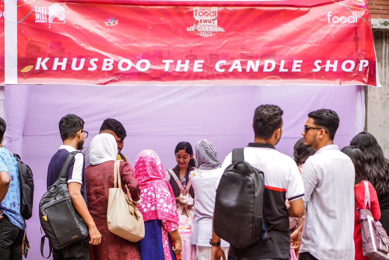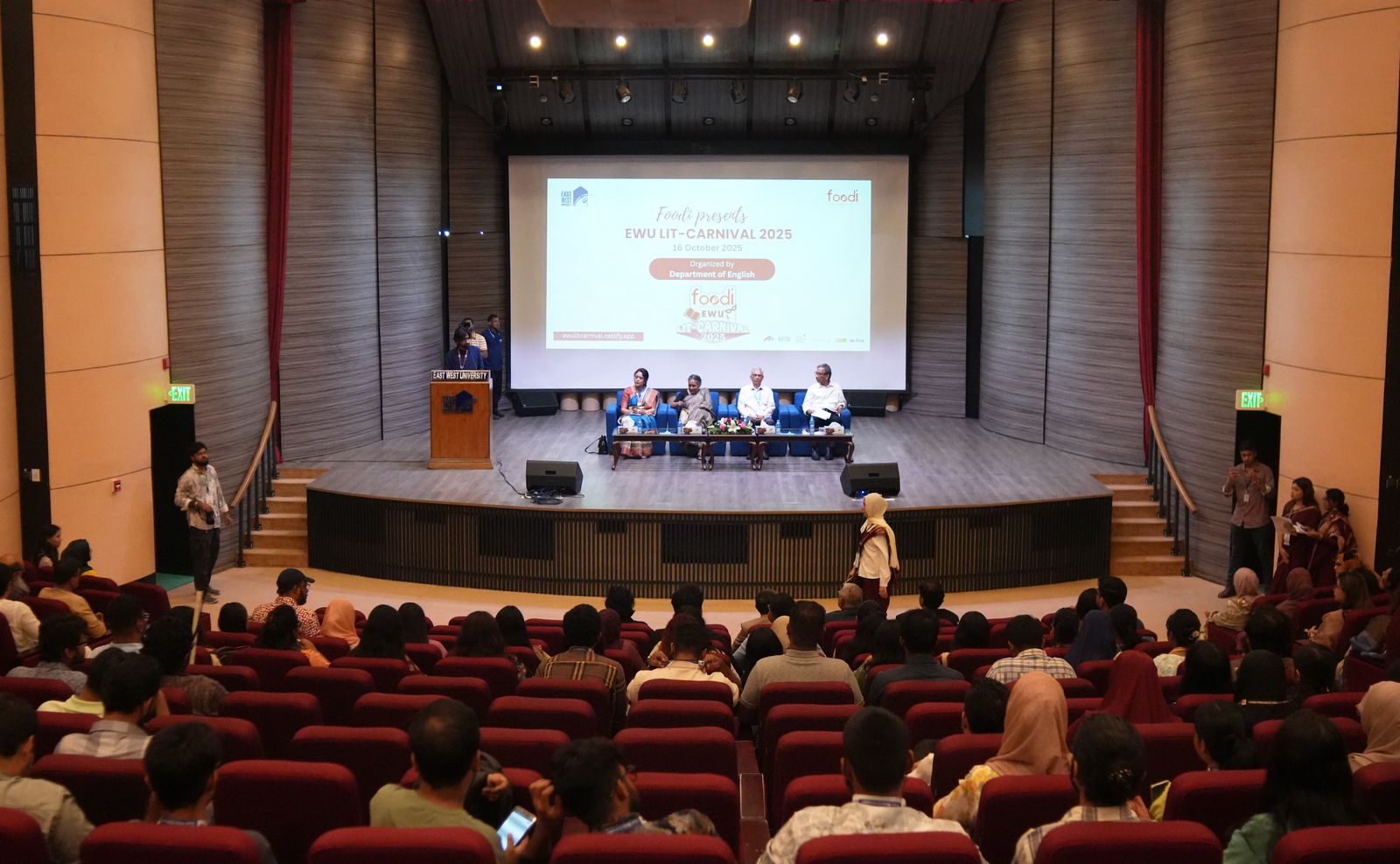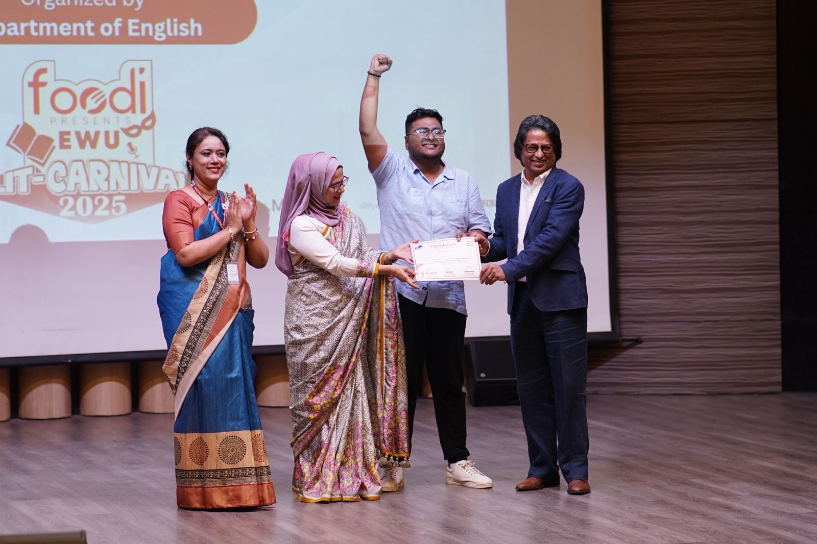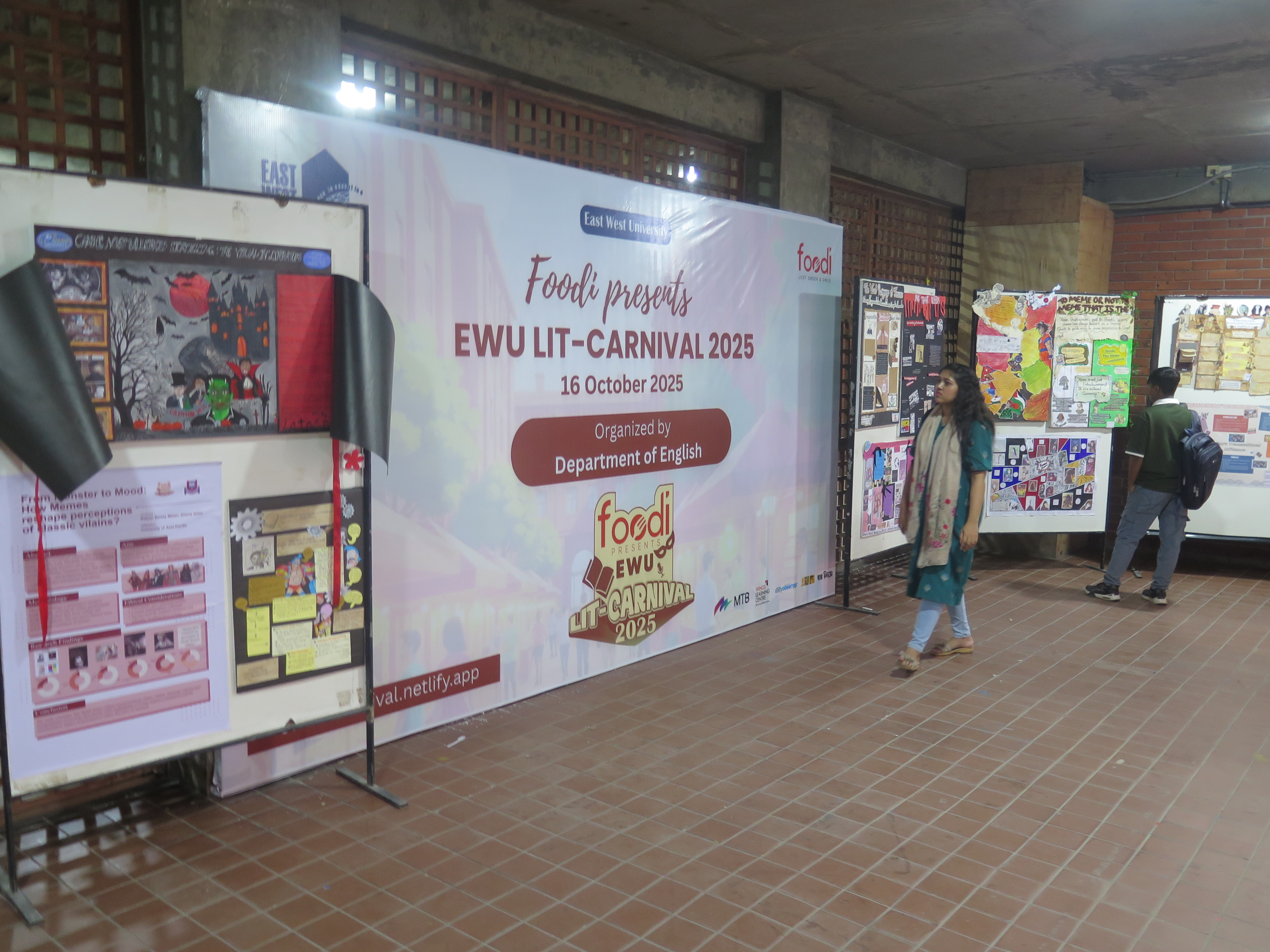 The Department of English, East West University, organized a day-long literary event titled "Foodi Presents EWU Lit- Carnival 2025" on October 16, 2025. Amidst much excitement and enthusiasm of participants, attendees, and guests from all across Bangladesh, the event showcased the biggest celebration of literature and arts of the year. More than 200 students and literary enthusiasts from 22 public and private universities competed in various segments - from Spot Poetry and Recitation to Comic-Con andCosplay, Poster Presentations, Drama, and Masquerade. The carnival allowed them to exhibit their creativity and present their ideas to a wider audience. The festival also included interactive stalls, such as a literature-themed food court and a used-book swap. Professor Dr. Mohammed Farashuddin, the Chairperson of the Board of Trustees of East West University, and Professor Shams Rahman, the Vice Chancellor of East West University, were present at the opening and concluding ceremony respectively. Ms. Luva Nahid Choudhury, the Director General of Bengal Foundation, inaugurated the program as the Chief Guest. Ms. Munize Manzur, a member of the Board of Trustees of East West University, was invited as one of the esteemed judges. Renowned academics and cultural figures—including Dr. Fakrul Alam, Dr. Ahmed Ahsanuzzaman, Ms.Tahmina Ahmed, and Mr. Mashrur Shahid Hossain also graced the event with their presence.