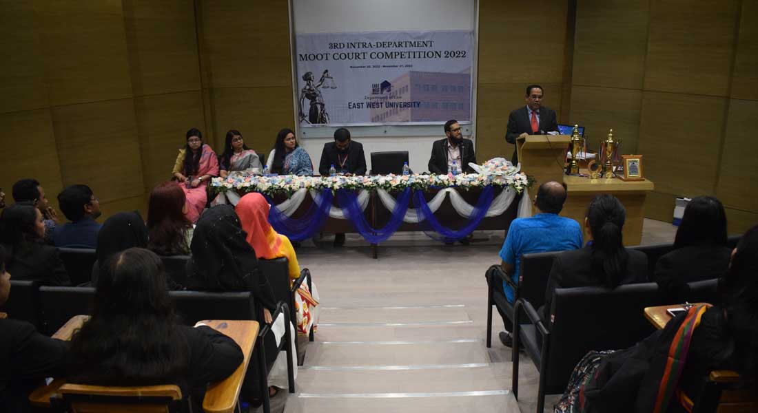Department of Law, East West University organized the 3rd Intra-Department Moot Court Competition, 2022 from 25-27th November 2022. A total of 12 teams from different semesters participated in this competition. Each team consisted of four members, two students as speakers, one as a researcher, and one as an intern. The Inaugural Ceremony of the Competition was held on 25th November 2022 with the presence of the Guest of Honor, Dr. Khaled Hamid Chowdhury, Bar-at-Law, Advocate, Supreme Court of Bangladesh, and Head of Laws in London College of Legal Studies (South). He shed light on the importance of such events for Law students as it is the sole platform for them to engage in fictitious problems which are like real-life incidents, delve into them to hone their research skills, drafting skills, speaking skills, court manners, and etiquettes, etc.