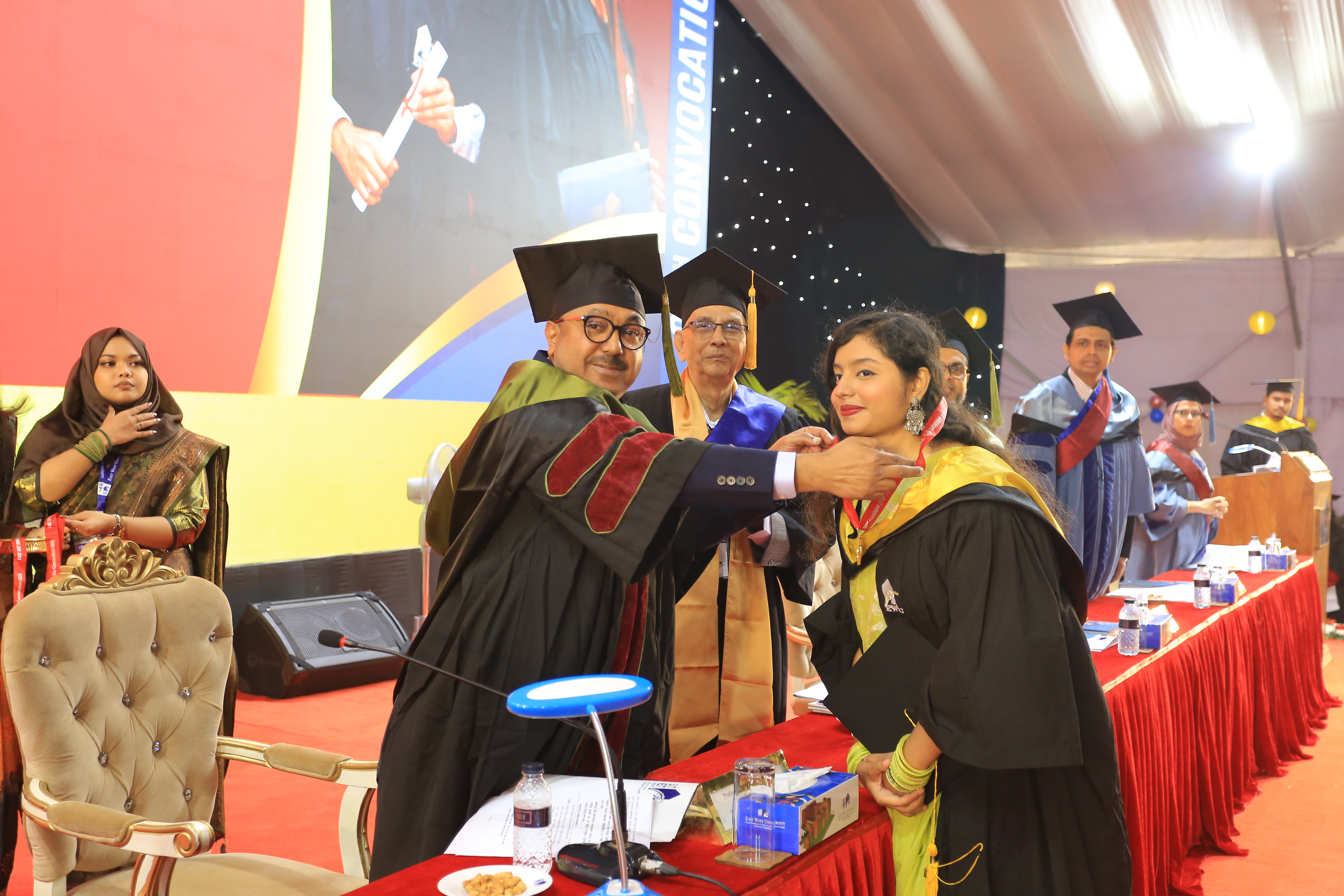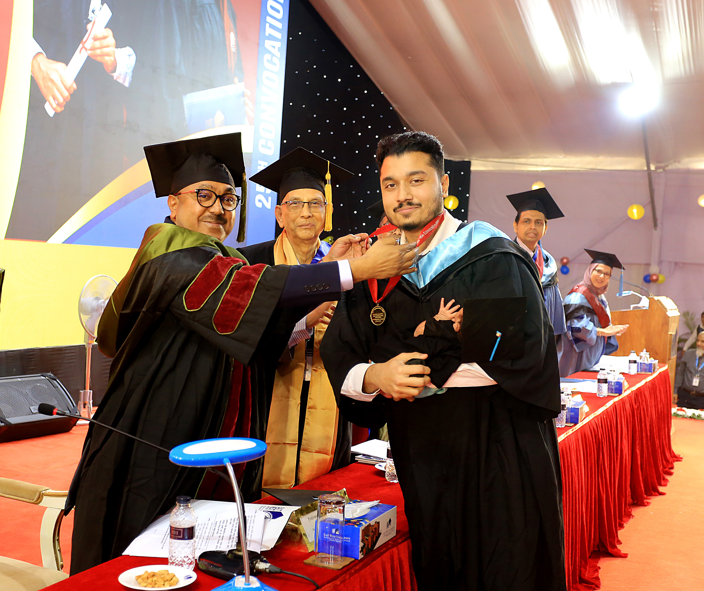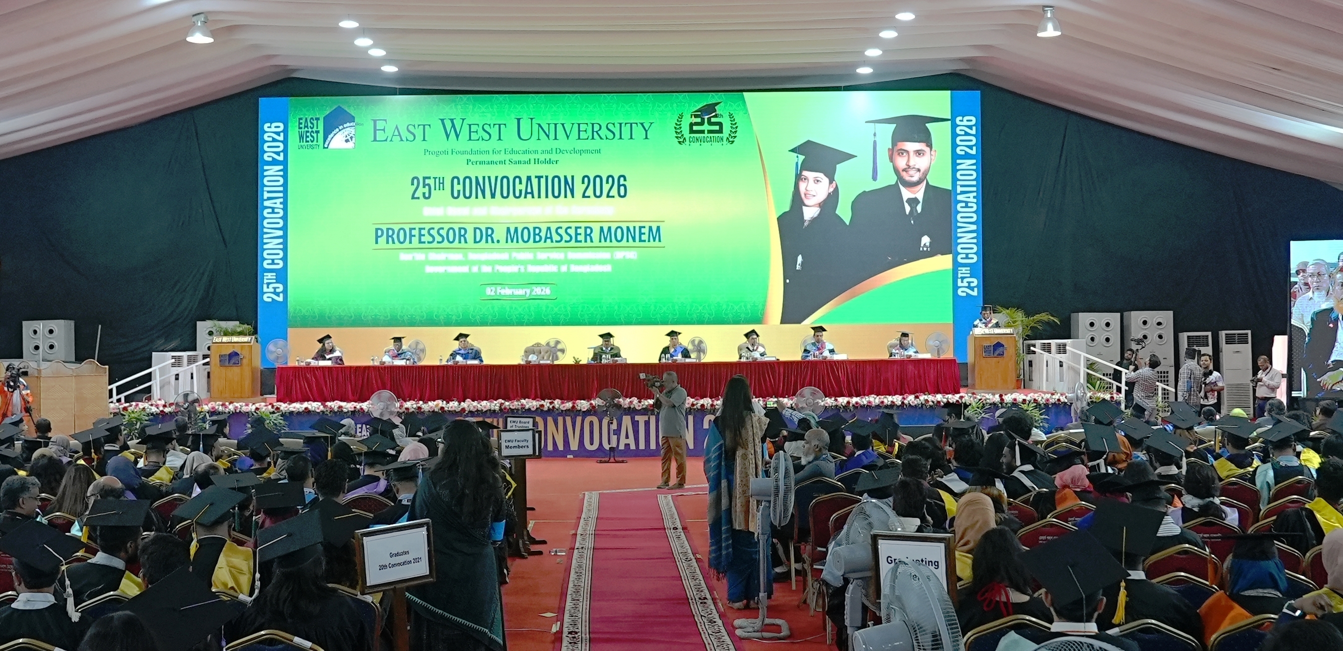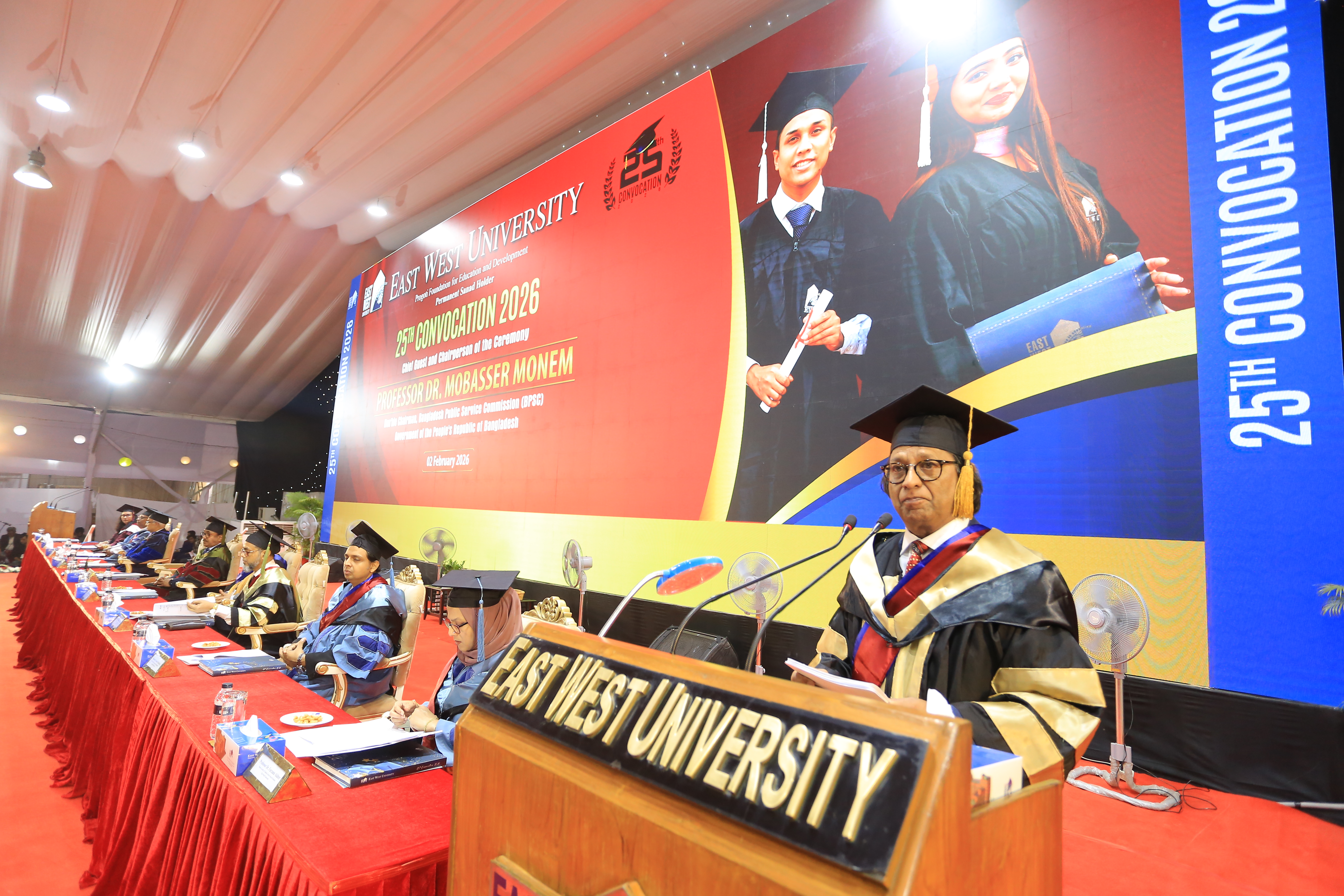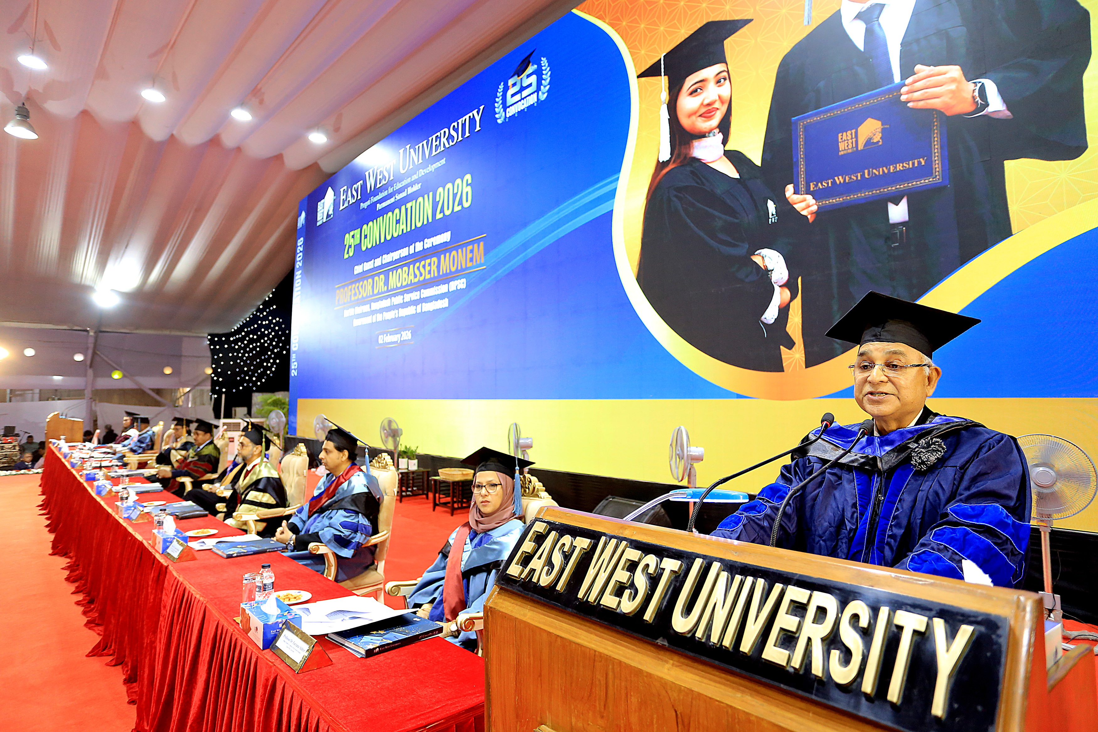 The 25th convocation of East West University (EWU) was held on 02 February 2026 (Monday) at Aftabnagar Playground in the capital. At the convocation, as the representative of His Excellency the President, the Chancellor of the university, Professor Dr. Mobasser Monem, Chairman of Bangladesh Public Service Commission (BPSC), presented degrees to the students. 1857 students of undergraduate and graduate programs were awarded certificates at this convocation. In addition, nine exceptionally meritorious students with a CGPA of 4.0 out of 4.0 were awarded gold medals.