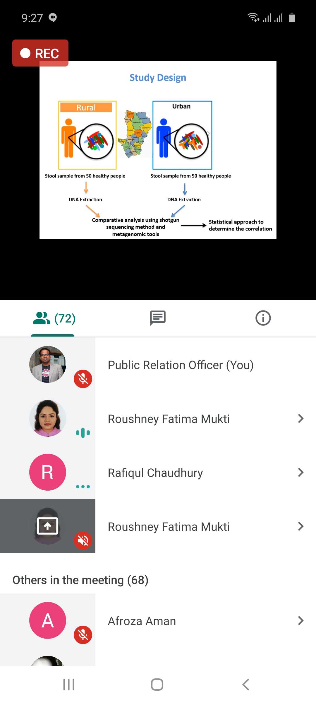 East West University Center for Research and Training (EWUCRT) organized a Research Seminar titled “A dataset on human gut microbiome and resistor of urban and rural people in Dhaka: A comparative metagenomics approach". The online seminar (webinar) was held on 17 September 2020 on Google Meet app. The research paper presenters of the seminar were Ms. Nusrat Jahan Antora, Lecturer, Dr. Suraia Nusrin, Assistant Professor and Chairperson, and Ms. Roushney Fatima Mukti, Senior Lecturer, Department of Genetic Engineering and Biotechnology, East West University, (EWU).