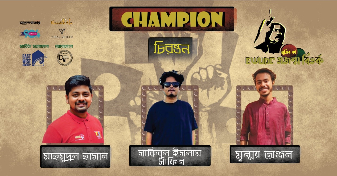 On December 11, EWUDC organized a day-long Intra-generational debate and concluded the day with a special Break Night where there was a cultural program. The teams that progressed to the finals were Anirban and Chironton, who then competed in a vigorous and passionate debate on December 16. On the concluding day of the event, EWUDC invited esteemed guests including Honorable Freedom Fighter Momtaz Ara Rumi, Renowned writer Jhorna Rahman and Heroic Freedom Fighter, Writer, Researcher Secretary General, Sector Commanders Forum - Liberation War '71, Haroon Habib.