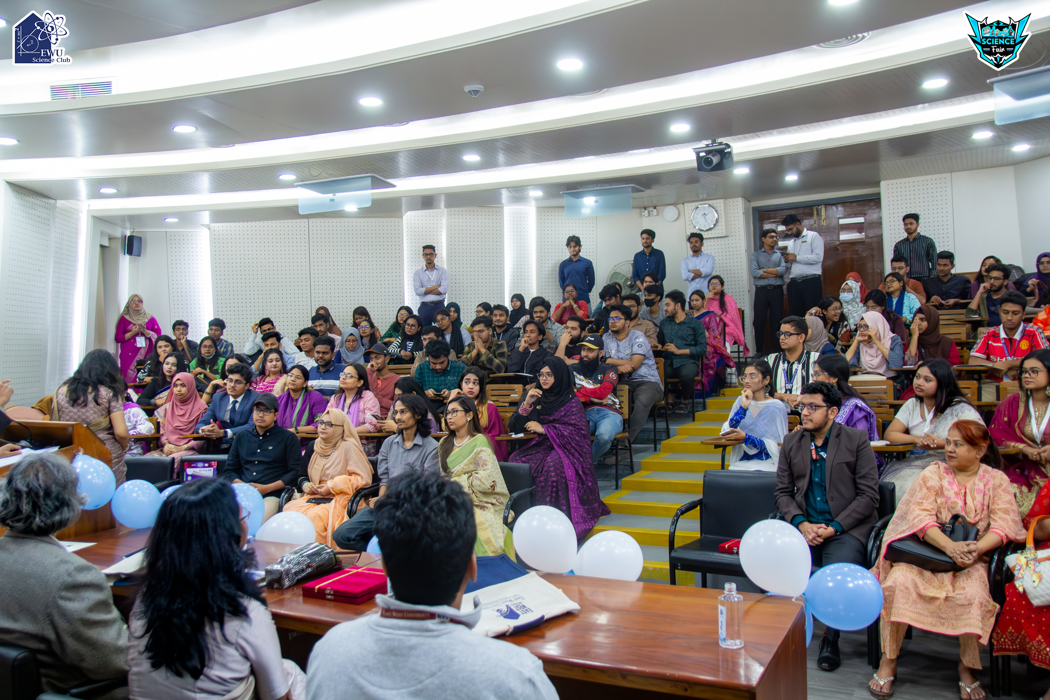 Distinguished guests included Dr. Anindita Paul, Founder of the Science Club and Chairperson of the Department of Mathematical and Physical Sciences, Dr. Gurudas Mandal, Professor at the same department, and Dr. Md. Hamed Hussain, Assistant Professor at the Department of Genetic Engineering and Biotechnology. Additionally, Khairum Islam, EWUScC Alumnus and Lecturer at the Department of CSE, shared his inspiring journey with the students.