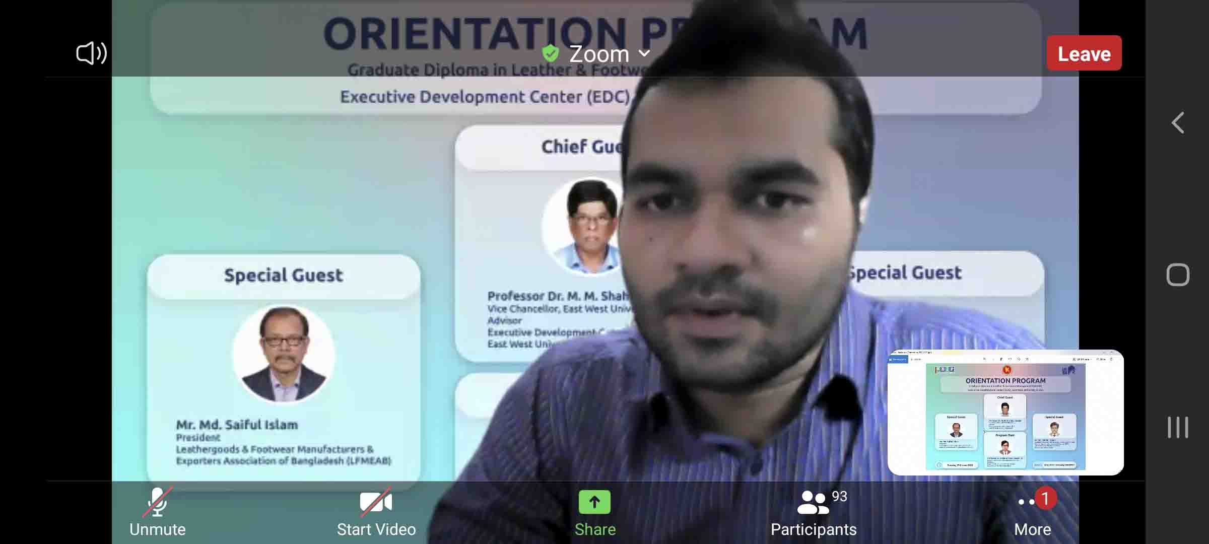 The Skills for Employment Investment Program (SEIP) Executive Development Center (EDC) of East West University (EWU) arranged an orientation program for the Graduate Diploma in Leather and Footwear Management students. The online orientation program was held on 05 October 2021 through Zoom. The main purpose of the program is to increase the efficiency of the managers through scaling up skills and productivity of the existing managers in the leather and footwear industries in Bangladesh.